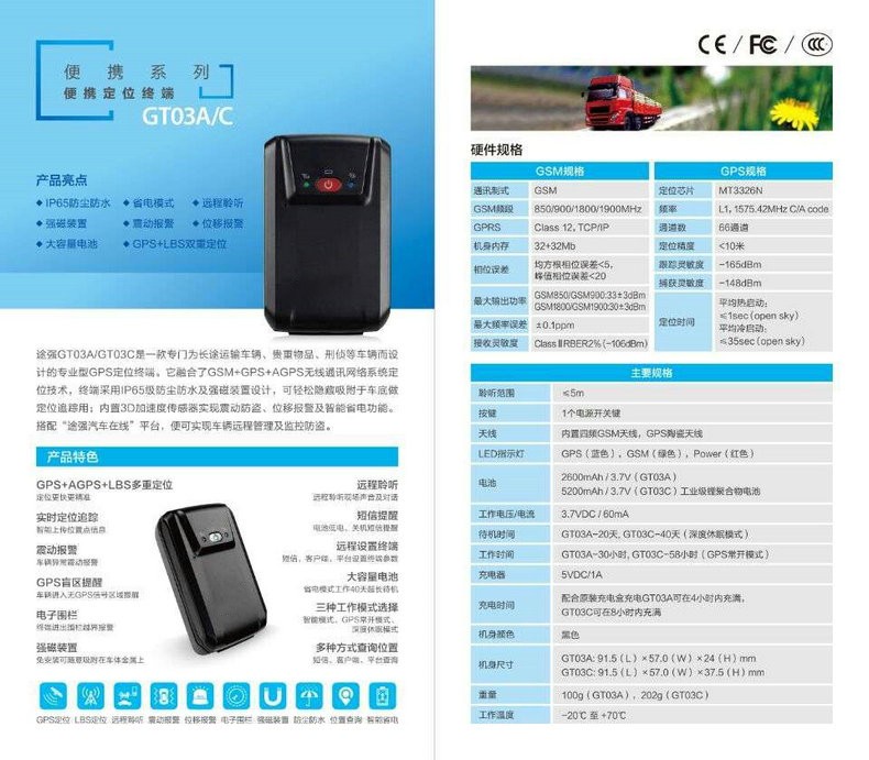 途強(qiáng)GT03A/GT03C是一款專門為長途運(yùn)輸車輛、貴重物品、刑偵等車輛而設(shè)計(jì)的專業(yè)型GPS定位終端。它融合了GSM+GPS+ AGPS無線通訊網(wǎng)絡(luò)系統(tǒng)定位技術(shù),終端采用IP65級防塵防水及強(qiáng)磁裝置設(shè)計(jì),可輕松隱藏吸附于車底做定位追蹤用:內(nèi)置3D加速度傳感器實(shí)現(xiàn)震動(dòng)防盜、位移報(bào)警及智能省電功能。